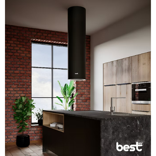 شفاط جزيرة استانلس أسطواني أسود بيست إير CONO 38CM BK يجمع بين التصميم العصري والأداء القوي، مزود بموتور FIME إيطالي، قوة شفط 1000 م³/س، فلاتر معدنية وكربونية، وإضاءة LED لضمان تهوية مثالية للمطبخ.