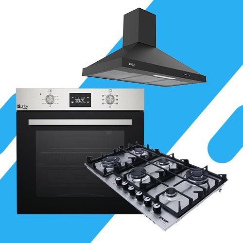 بيورتي بلت إن - فرن كهرباء 60 سم (OPT60EED) + مسطح 90 سم ستانليس 6 عين غاز (HPT904S ) + شفاط هرمي 90 سم، قوة شفط 850 م3/ساعة، ( PANSY PRO BL 90)