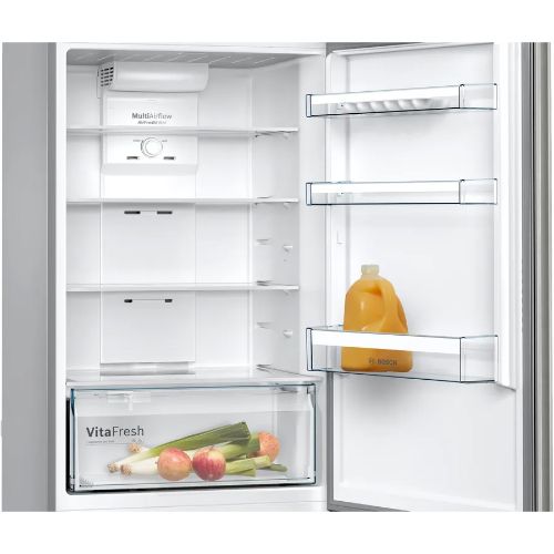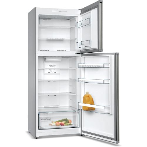 استمتع بتخزين واسع وحفظ مثالي للأطعمة مع ثلاجة بوش KDN43VL2E8 من سيريس 4 بسعة 365 لتر، مزودة بفريزر نو فروست، تقنية VitaFresh لحفظ الخضار والفواكه طازجة، وميزة CoolExtend التي تحافظ على الطعام مجمدًا حتى 30 ساعة في حال انقطاع الكهرباء.