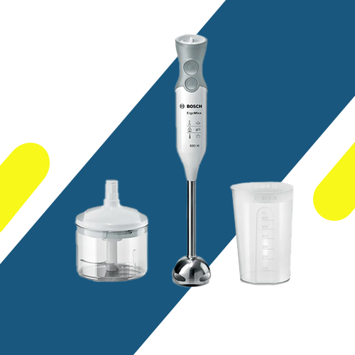 استمتع بتحضير الشوربات، الصلصات والمشروبات بسهولة مع هاند بلندر MSM66120 بوش ErgoMixx بقوة 600 وات، تصميم مريح، سرعات متعددة وملحقات عملية لتجربة طهي مثالية كل يوم.
