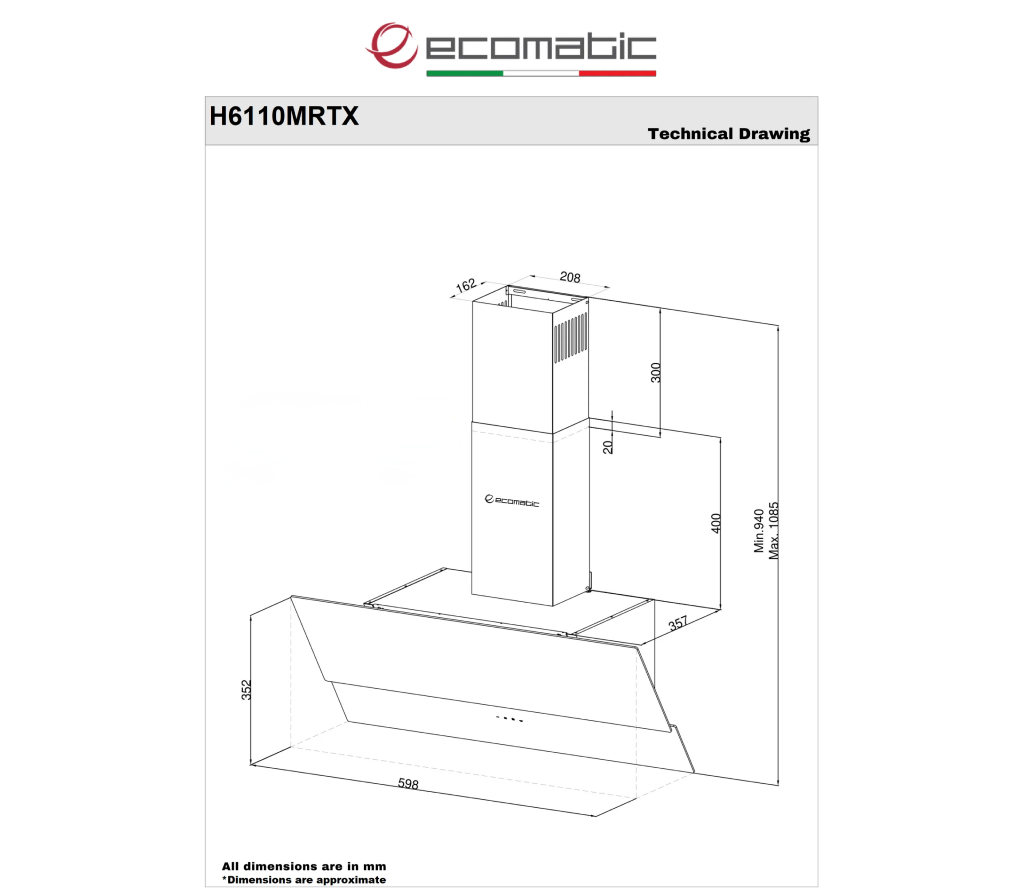 مواصفات شفاط مطبخ إيكوماتيك 60 سم بزاوية مائلة – كريستال أسود – قوة شفط 1000 م³/ساعة – H6110MRTX