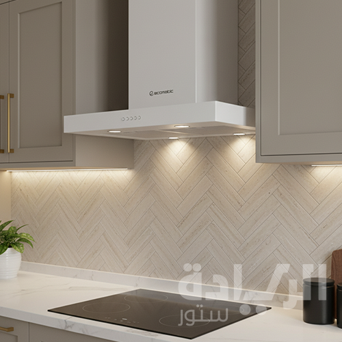 شفاط مطبخ إيكوماتيك بحجم 60 سم بتصميم موديل H66TB حرف T من الستانلس ستيل، قوة شفط 650 م³/ساعة، تحكم بـ3 سرعات، إضاءة LED قوية، وضمان 10 سنوات.