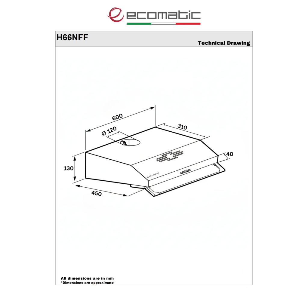 مواصفات شفاط مطبخ إيكوماتيك 60 سم فلات استانلس ستيل – 2 موتور – 3 سرعات – قوة شفط 650 م³/س – موديل - H66NFF: