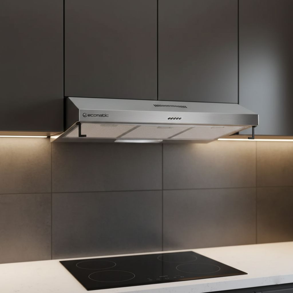 شفاط مطبخ إيكوماتيك 60 سم فلات H66NFF من الستانلس ستيل بتصميم أنيق، مزود بمحركين قويين و3 سرعات لتجربة تهوية فعالة. يحتوي على فلتر معدني سهل التنظيف وفلتر كربوني، مع إضاءة LED موفرة للطاقة. يدعم التشغيل بنظام المدخنة أو الفلترة الداخلية.