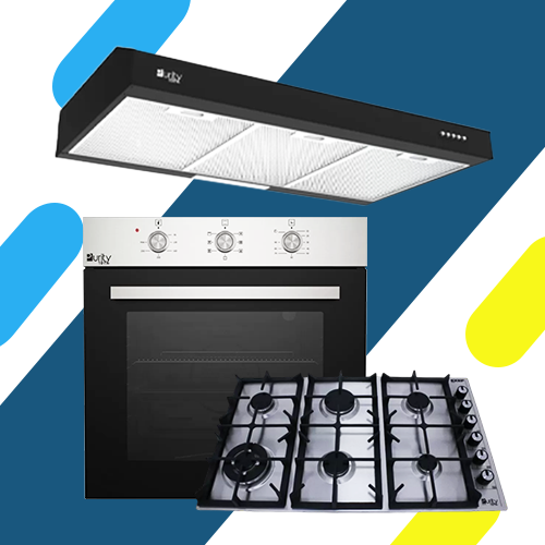 صفات ومزايا طقم بلت إن بيورتي: فرن غاز 60 سم OPT601GG، مسطح 90 سم HPT903S، وشفاط 90 سم PTSLIM BL