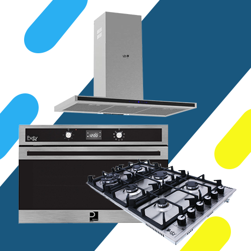 طقم بيورتي بلت إن: فرن غاز 90 سم OPT901GXD، مسطح غاز 90 سم HPT903S، وشفاط حرف T موديل TS PRO