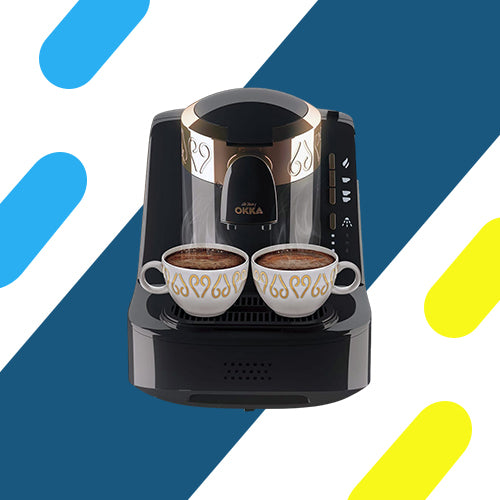 ماكينة تحضير القهوة التركية أوكا أرزوم – أسود/نحاسي – موديل OK001/BLACK. تجمع بين التصميم الفاخر والأداء العملي، مع تحضير سريع خلال 80 ثانية أو تسوية بطيئة (سبرتاية) في 4 دقائق. مزودة بميزة الصب التلقائي في الفناجين، وتنظيف ذاتي، وتحضير كوبين معًا.