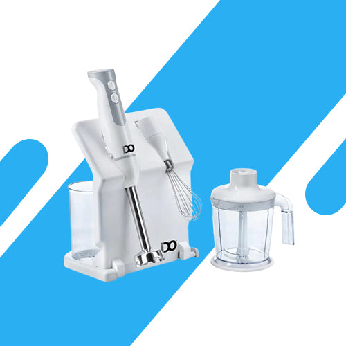 استمتع بتحضير العصائر والصوصات والخلطات بسهولة مع أي دو هاند بلندر HBLG800-WH مجموعة بالاستاند، مزود بدورق 600 مل، وعاء كبة 700 مل، شفرات وعصا خلط من ستانلس ستيل، 2 سرعات للتحكم، وملحقات متنوعة مع ضمان سنتين.