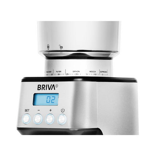استمتع بطحن احترافي ودقيق مع طاحونة القهوة بريفا GRIND MASTER SS المزودة بـ 51 إعداد طحن، شفرات مخروطية من الستانلس ستيل، ووضعيات تشغيل متعددة (مباشر للبورتافلتر أو داخل الحاوية). مع محرك قوي 180 واط وشاشة LED سهلة الاستخدام، ستضمن لك أفضل نكهة قهوة طازجة كل يوم.